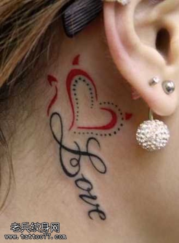 耳部美女爱心文字纹身图案