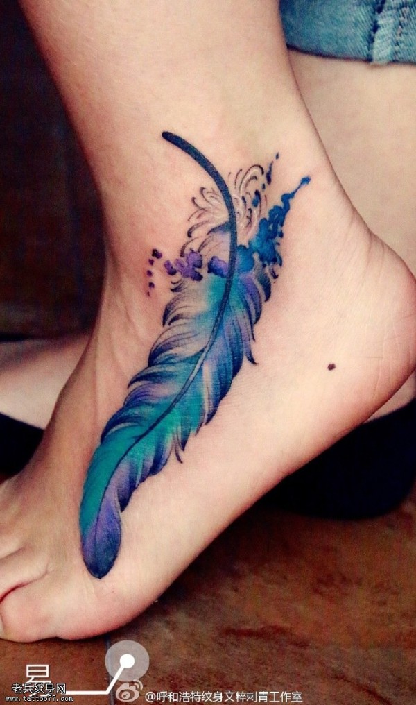 脚丫子上的水彩羽毛纹身图案