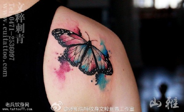 肩部水彩漂亮的蝴蝶纹身图案