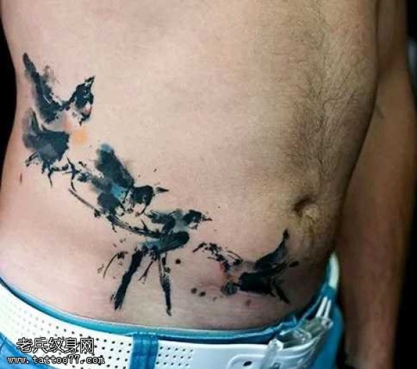 腰部水墨鸟纹身图案
