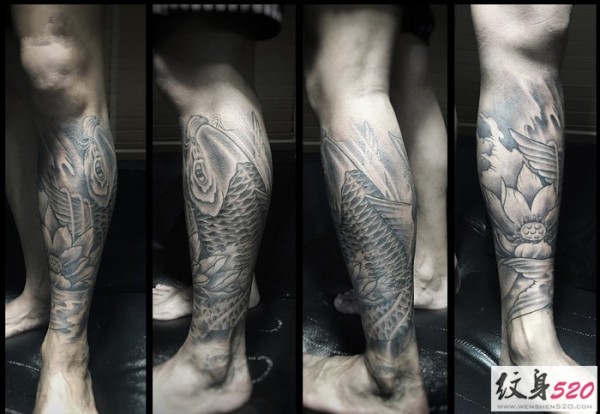 传统鲤鱼花小腿纹身_腿部纹身图案大全_纹身图吧