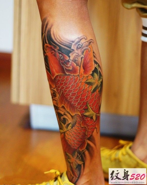 传统鲤鱼花小腿纹身_腿部纹身图案大全_纹身图吧