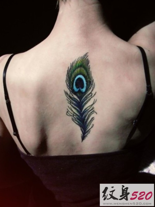 背部美丽精致的孔雀翎孔雀羽毛纹身