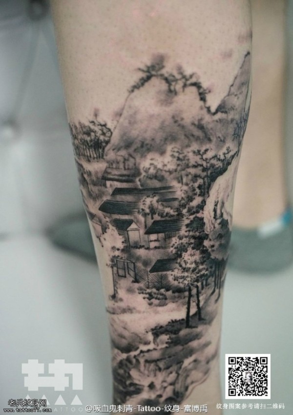 大腿上水墨中国画纹身图案