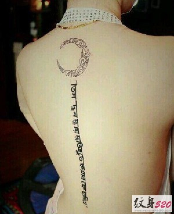 女生背部长条梵文纹身