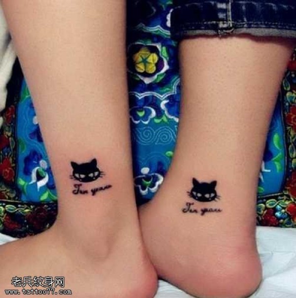脚部黑色猫咪爱情情侣纹身图案