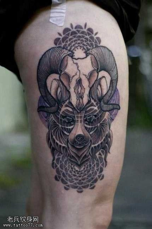 腿部经典的羊头纹身图案