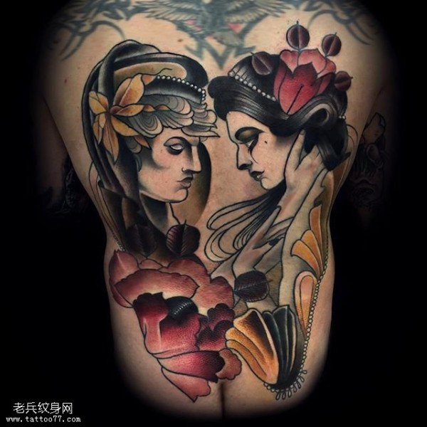 背部彩绘两姐妹纹身图案