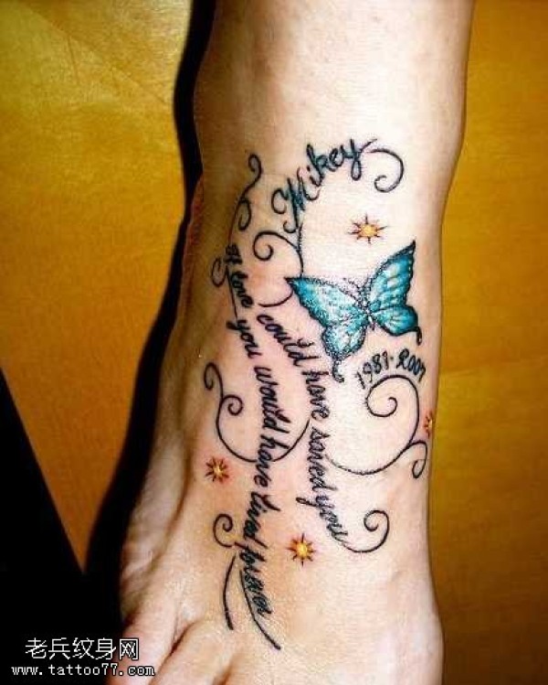 脚部漂亮的蝴蝶英文纹身图案