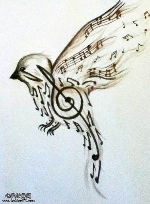 手稿漂亮好看的音符小鸟纹身图案