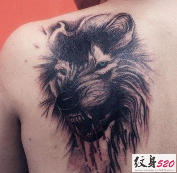 背部凶狠嗜血的狼头纹身
