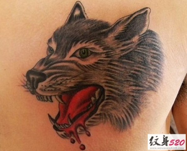 背部凶狠嗜血的狼头纹身