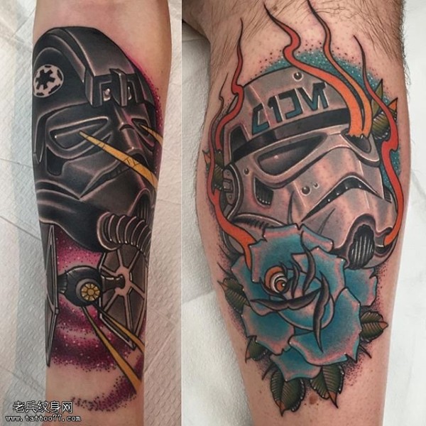 小腿上头盔玫瑰纹身图案