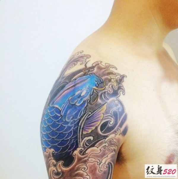 大臂上的抢眼蓝色鲤鱼纹身图片
