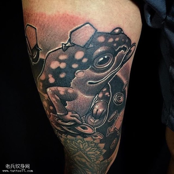 大腿黑灰金蟾纹身图案