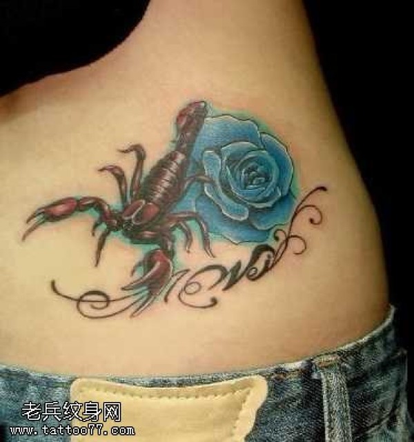 腰部彩色蝎子玫瑰纹身图案