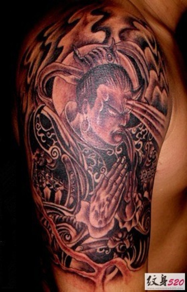 手臂大臂上个性霸气的二郎神杨戬纹身图案