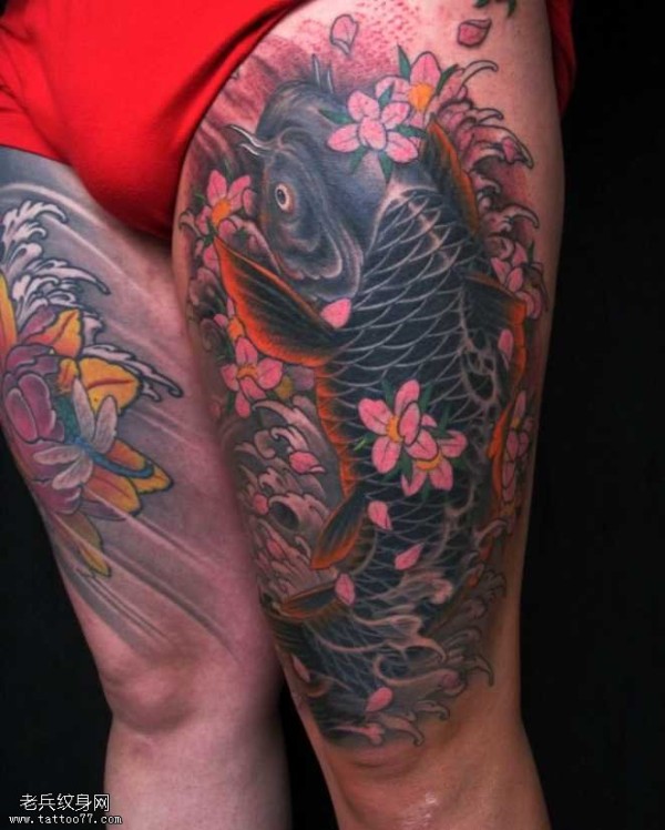 传统鲤鱼花小腿纹身_腿部纹身图案大全_纹身图吧