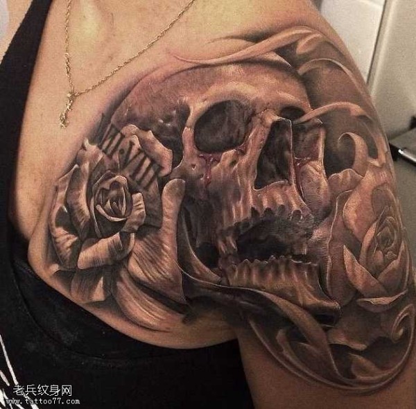 女生手臂经典潮流的骷髅与玫瑰花纹身图案