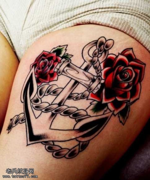 腿部漂亮的船锚花朵纹身图案