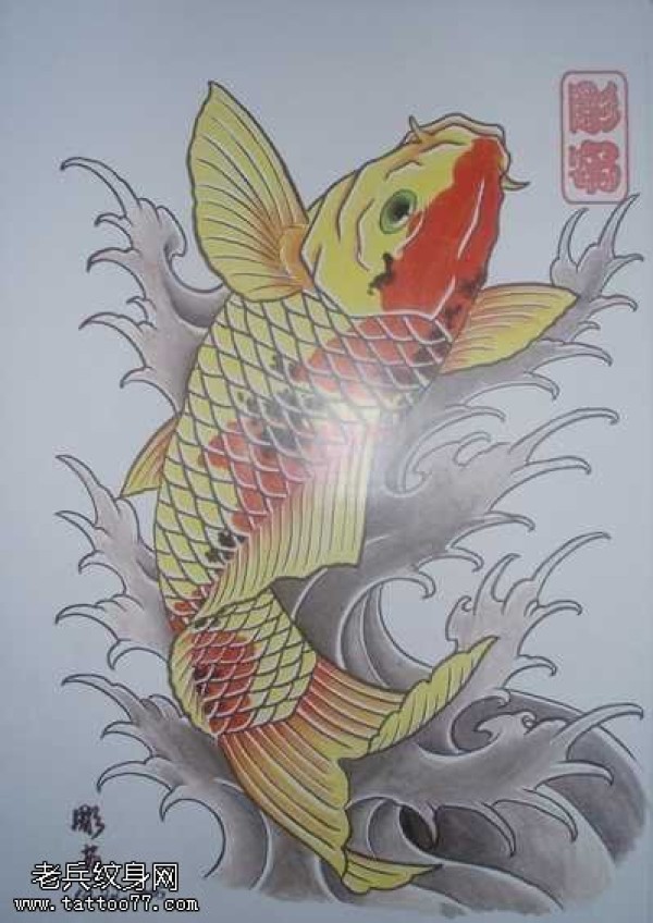 波涛之上跳跃的金鲤鱼纹身图案