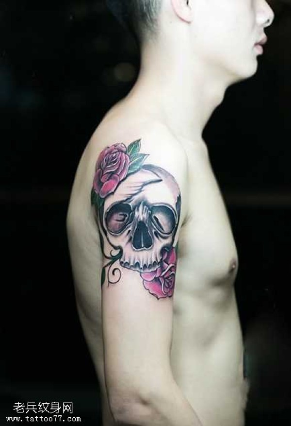 女生手臂经典潮流的骷髅与玫瑰花纹身图案