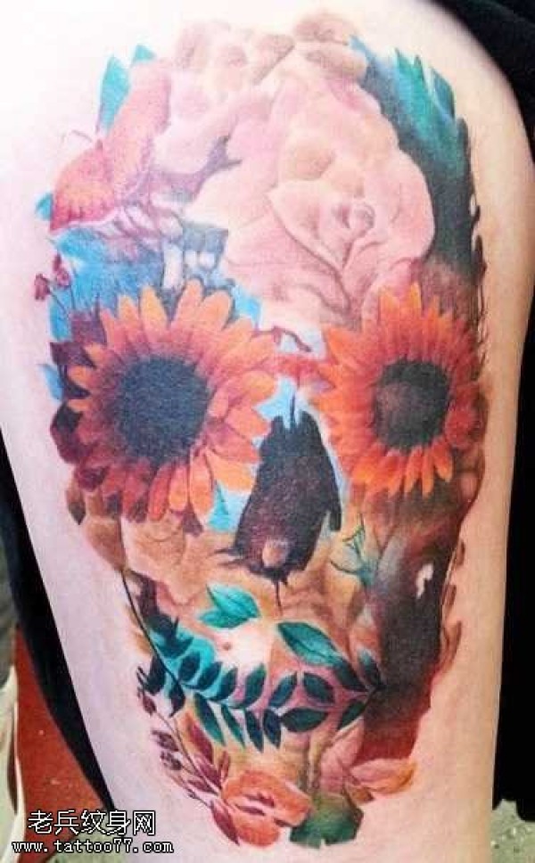 腿部漂亮的骷髅花纹身图案