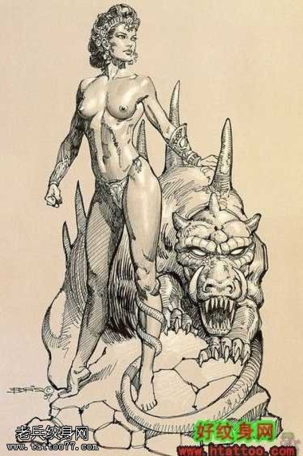 手稿女和野兽的组合纹身图案