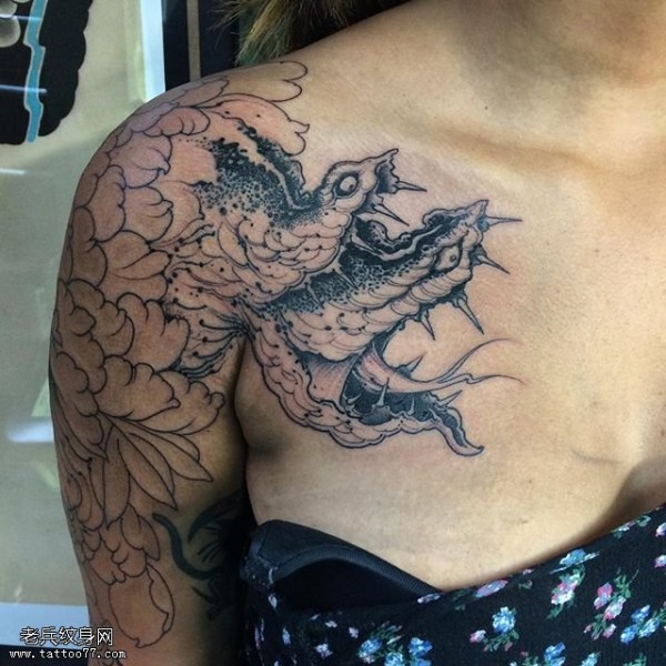 肩部线条牡丹蛇纹身图案