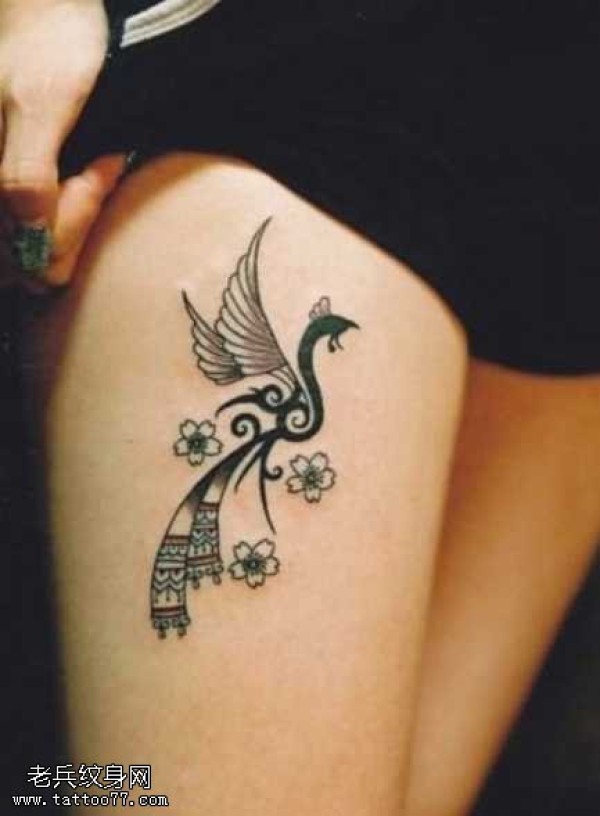 腿部高贵孔雀展翅纹身图案