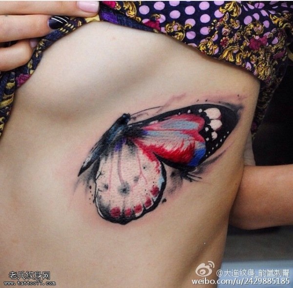 胸下水彩蝴蝶纹身图案