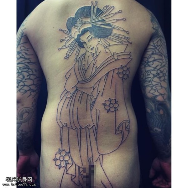 背部线条艺妓纹身图案