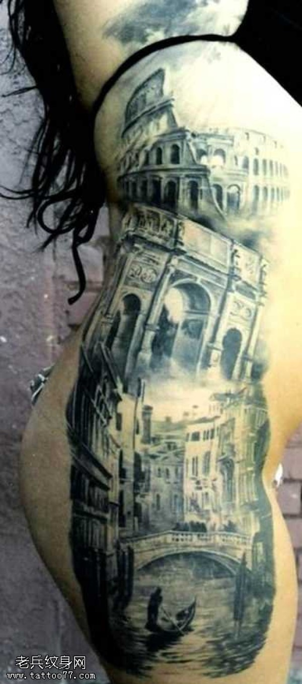 侧腰风景房子纹身图案