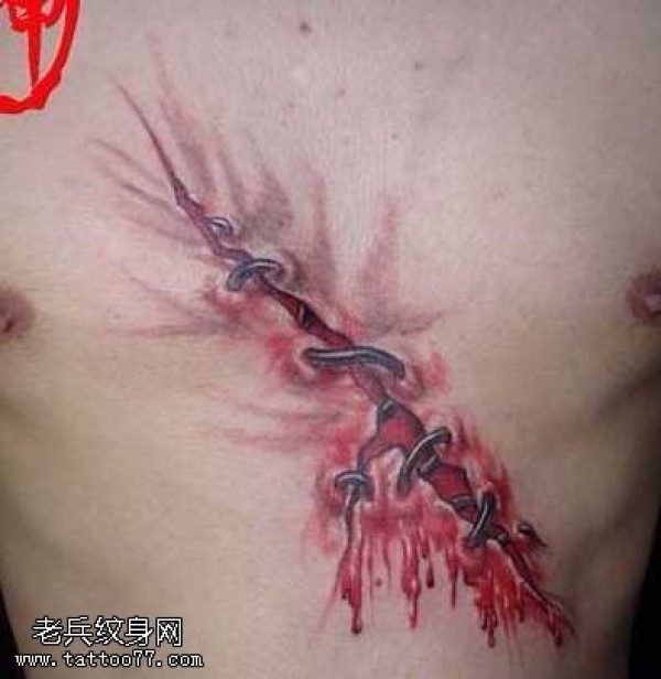 前胸另类潮流的撕皮纹身图案
