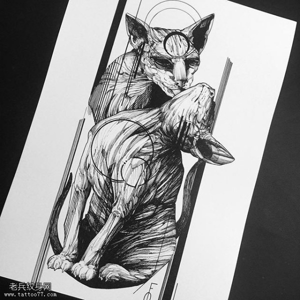手稿线条两只猫纹身图案