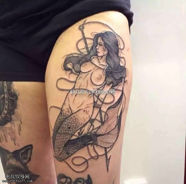 大腿点刺美人鱼纹身图案