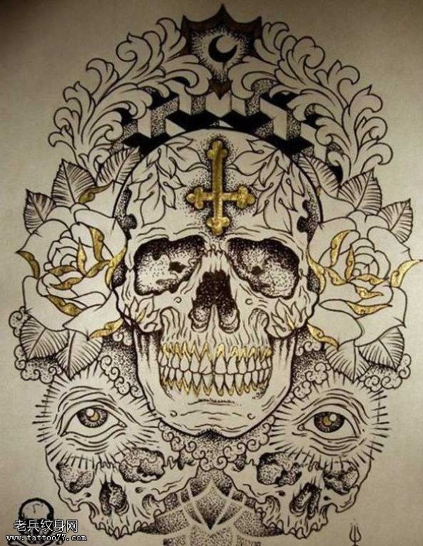 手稿彩色骷髅头纹身图案