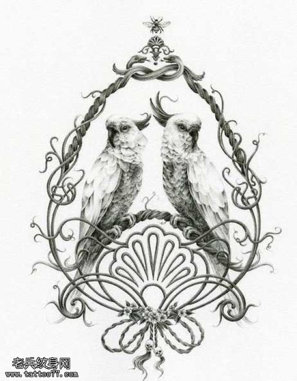 一对栩栩如生的鹦鹉纹身图案