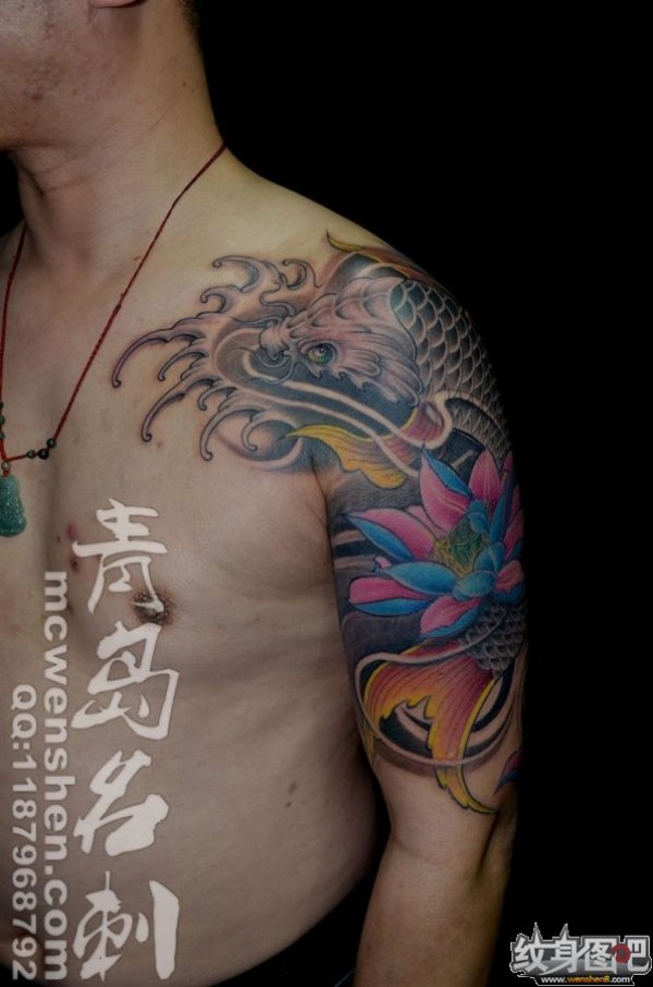 鲤鱼纹身,过肩鲤鱼纹身,半甲鱼纹身,青岛名刺纹身作品QQ;1187968792电话;13789865765