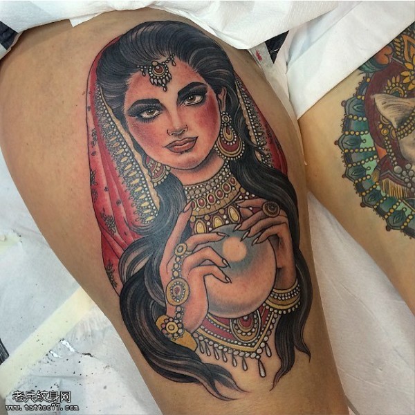 大腿部漂亮的印度女郎纹身图案