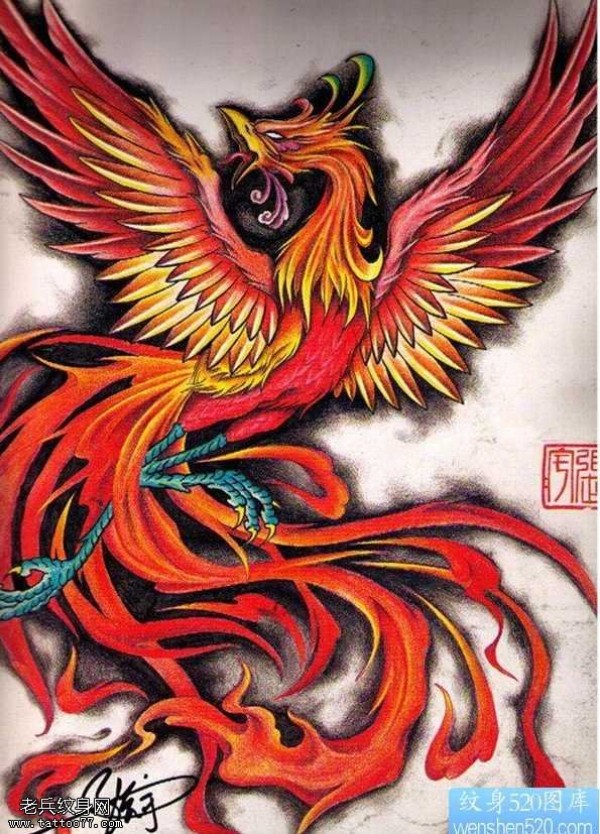 满背彩色凤凰纹身图案