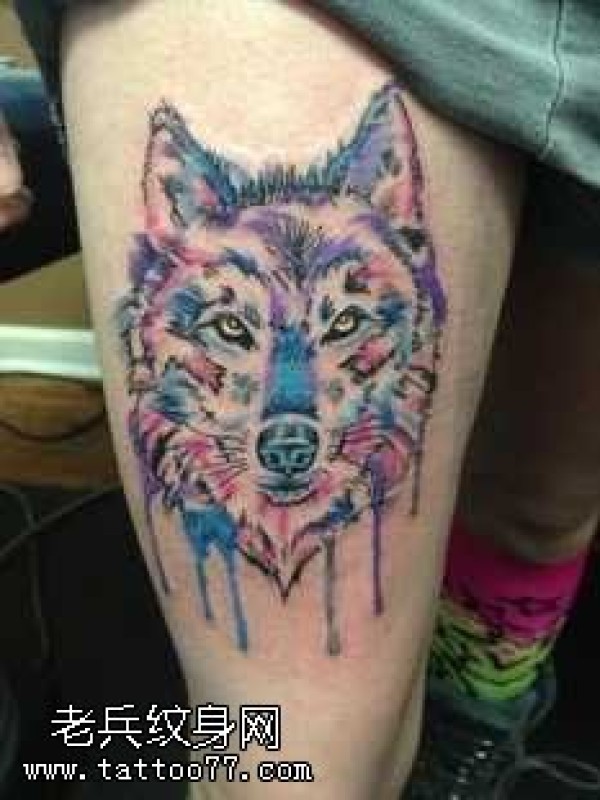 腿部温驯的狼头纹身图案