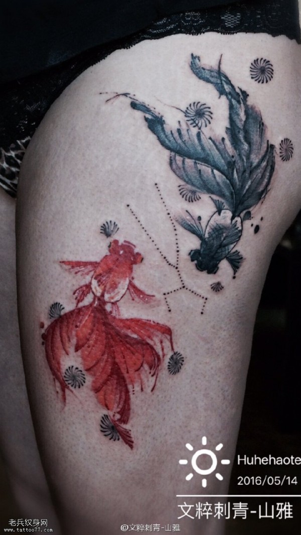 大腿水墨两条金鱼纹身图案