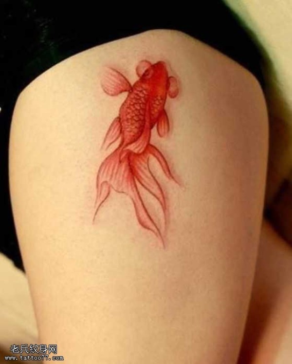 腿部一条红色金鱼纹身图案