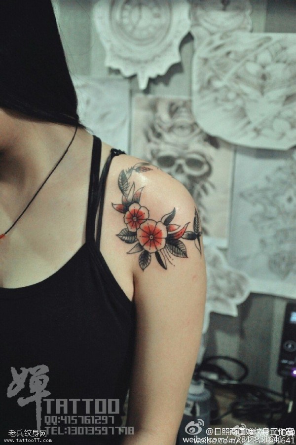女性肩膀上多款漂亮的花朵纹身图案