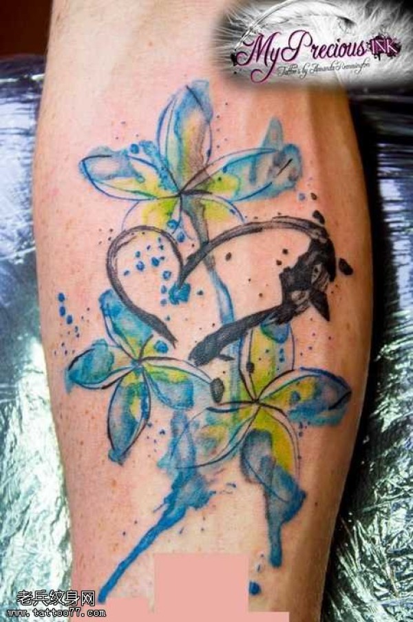 腿部一款水墨花纹身图案