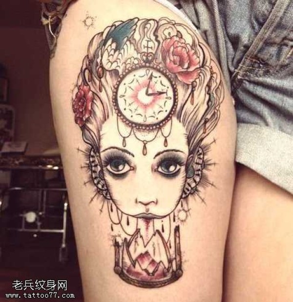 腿部美女头像纹身图案
