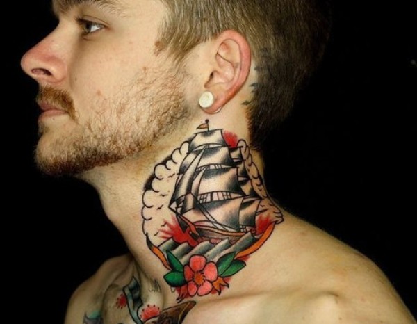 男人脖子彩色燕子刺青图案图片_脖子纹身图案大全_纹身图吧