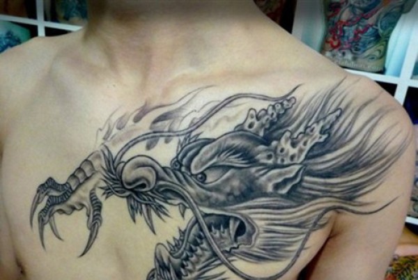 男士胸前威武霸气的龙头纹身