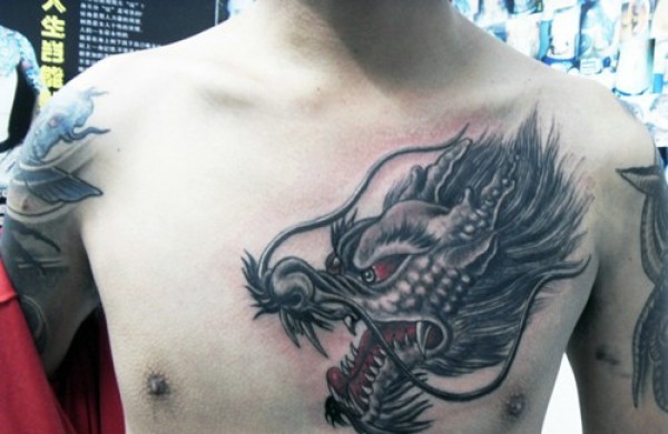 男士胸前威武霸气的龙头纹身